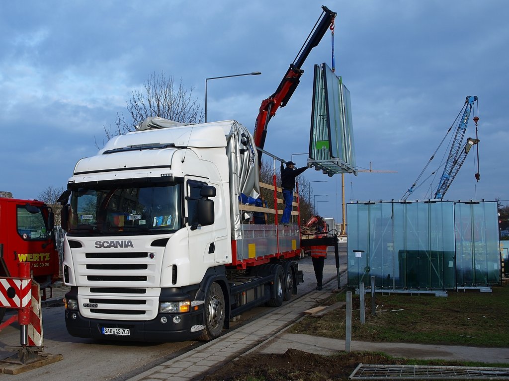 Scania R400 läd mit seinem Palfinger Kranaufbau Gestelle ab, auf denen Glasscheiben stehen. Gesehen am 14.02.2011 in Aachen