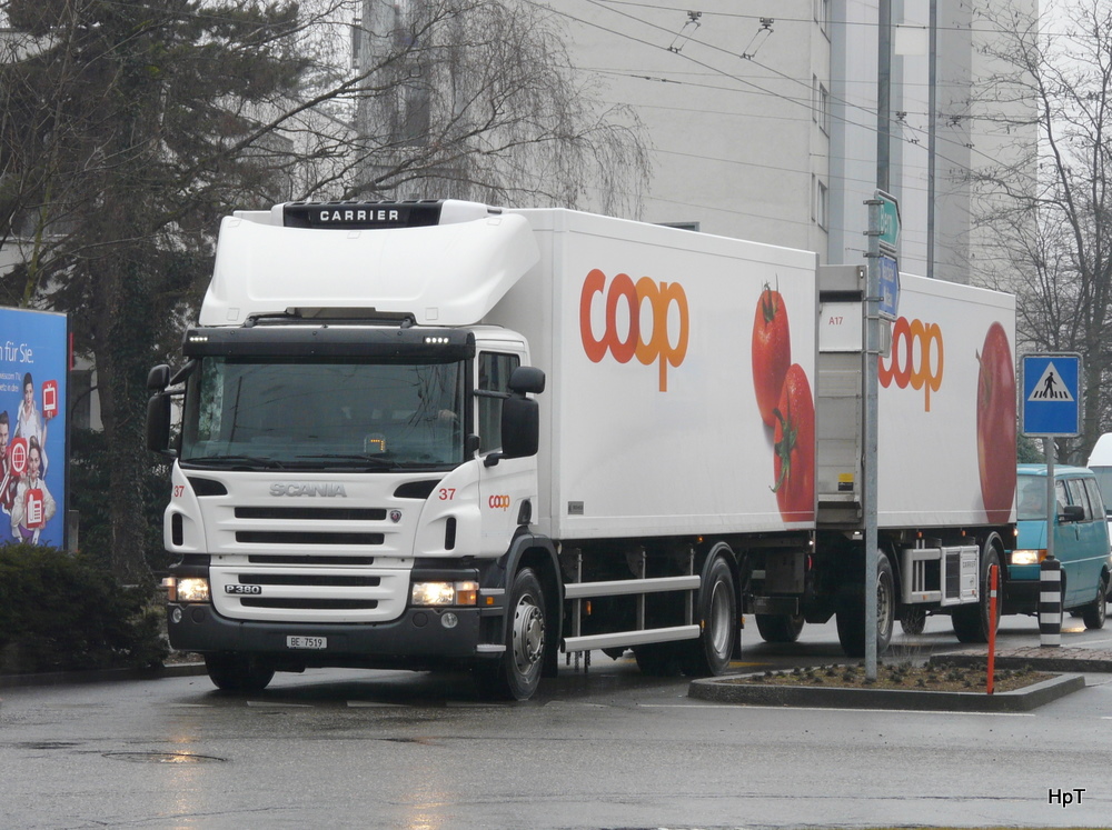 Ein Scania P 380 mit Anhänger unterwegs in Biel-Mett am 15.02.2011