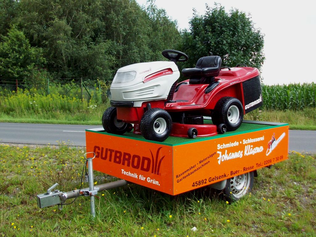 Werbeanhänger Johannes Kläsener mit Rasenmäher abgestellt in RE 26/07/2011