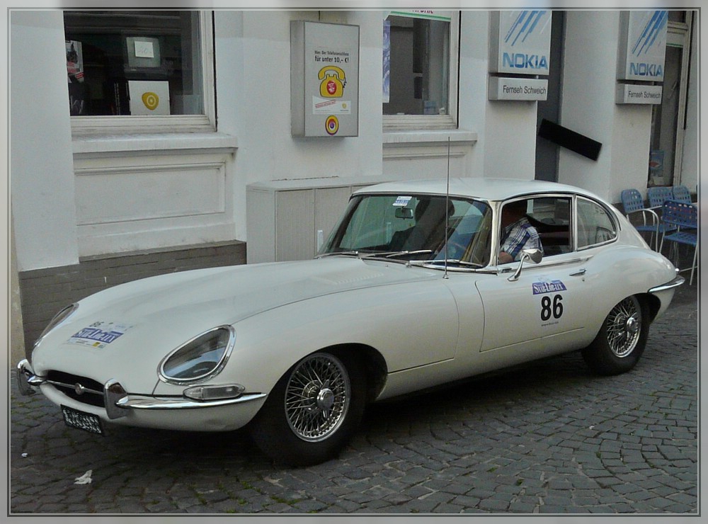 Dieser Jaguar E Typ Coupé, Bj 1967 hatte am 28.05.2011 auch an der Saar-Lor-Lux Rundfahrt teilgenommen.