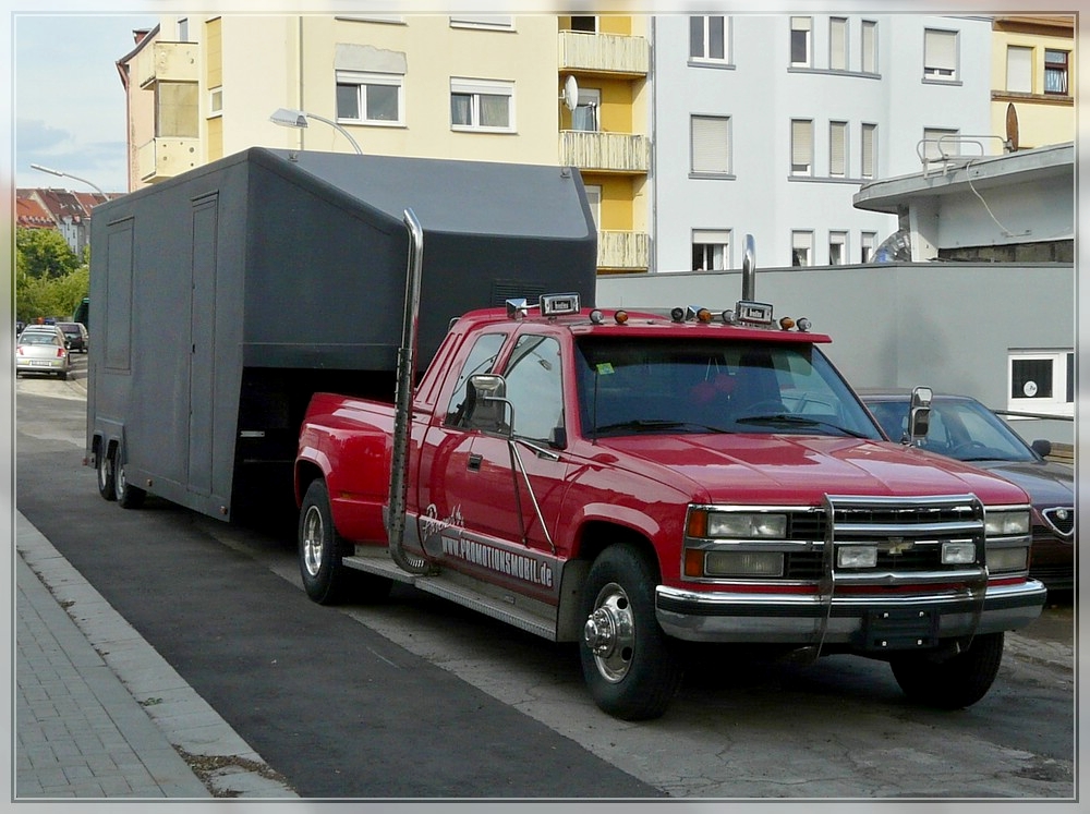 Ein für mich seltsames Gefährt fotografierte ich am 28.05.2011 bei einem Rundgang durch Saarbrücken. Ein Chevrolet Geländewagen als Zugmachine mit einem Hänger.