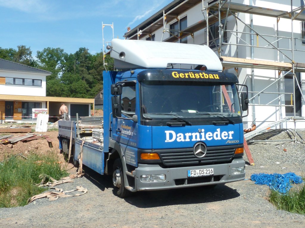 MB Atego 823 von der Firma "GERÜSTBAU DARNIEDER" steht zum Abtransport eines demontierten Gerüstes im 36100 Petersberg-Marbach, Mai 2011