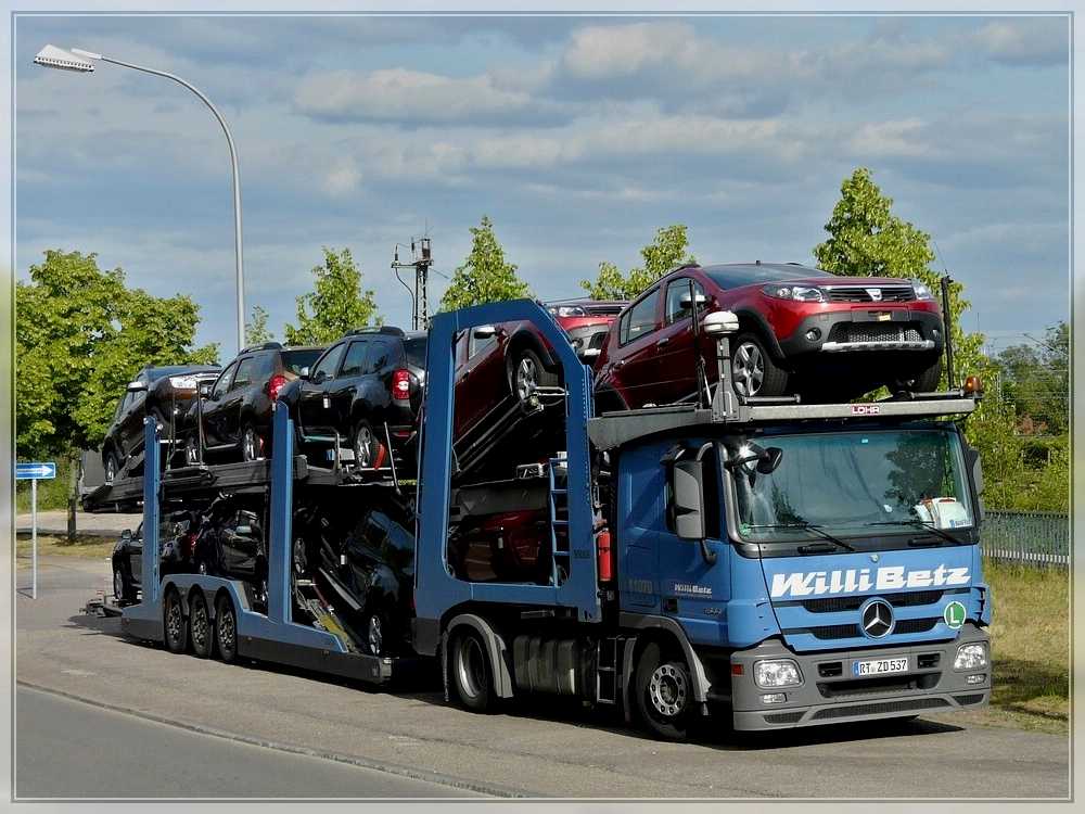Mercedes Benz 1844 Autotransporter beladen mit neuen Dacia Fahrzeugen aufgenommen am 28.05.2011.