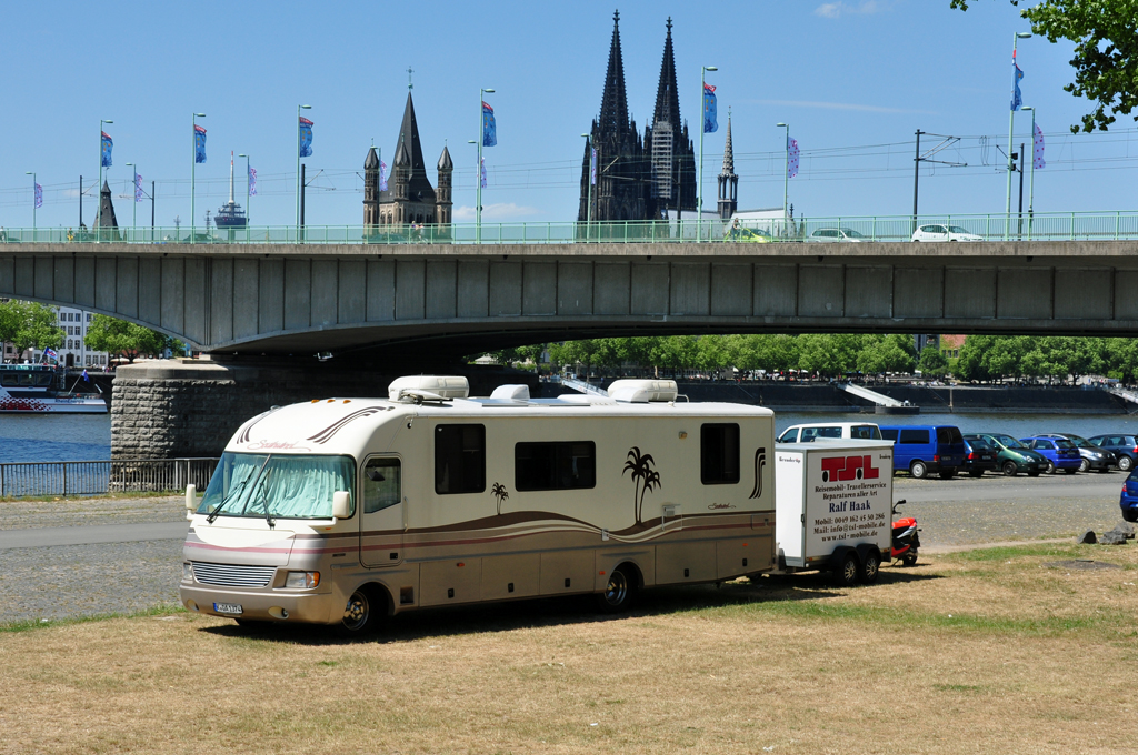 Wohnmobil mit Doppelachshänger bei der Severinbrücke in Köln - 30.05.2011