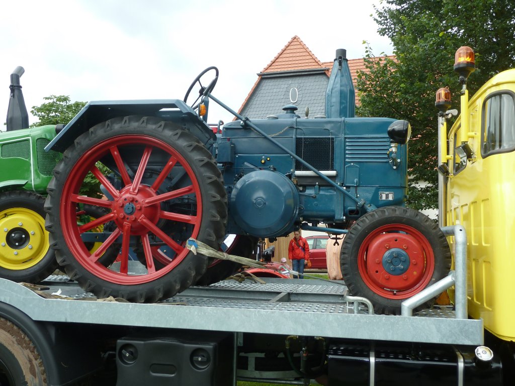 Lanz D 1616 steht festgezurrt auf der Ladefläche eines Scania Vabis anl. Oldtimerausstellung in Uttrichshausen, Juni 2011