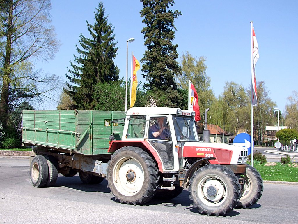 STEYR 970duo steuert mit dem Einachshänger zu einem Baumarkt;110409