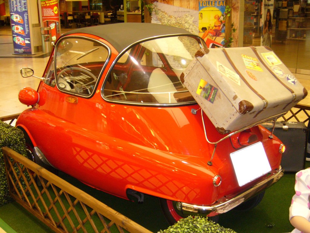 BMW Isetta. 1955 - 1962. Die BMW-Werke hatte die Lizenz und die Preßwerkzeuge für dieses Motocoupe genannte Rollermobil, von der italienischen Firma ISO übernommen. Statt des italienischen Zweitaktmotores wurde der Einzylindermotor aus dem Motorrad R25 verbaut. Hier wurde ein Isettamodell der 1955/1956 abgelichtet, das noch mit der kuppelartigen Verglasung einherkommt. Ausstellung "Legenden erleben" in Essen am 08.10.2011.