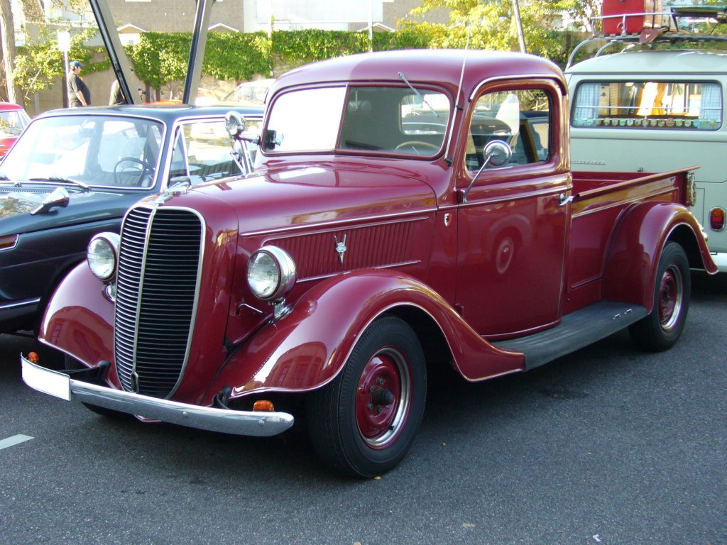 Ford V8 Pickup. 1932 - 1939. Der V8-Motor in einem Pickup war ein technischer Triumph, dem Ford´s schärfster Konkurrent Chevrolet bis 1955 nichts entgegenzusetzen hatte. Ford sorgte dafür, das dieser Vorzug für jedermann unübersehbar war, in dem man das V8-Emblem auf die Motorhaube montierte und in die Radkappen (bei dem abgelichteten Wagen leider nicht vorhanden) einprägte. Besucherparkplatz der Classic Remise am 01.10.2011.