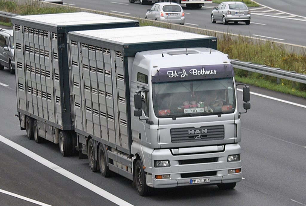 Mercedes Actros Viehtransporthängerzug auf der A2 bei Lehrte am 14.09.2011.