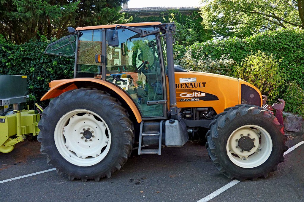 Claas Arion 430 steht auf einem Tankstellengelände in Dombas/Norwegen, Juli 2011