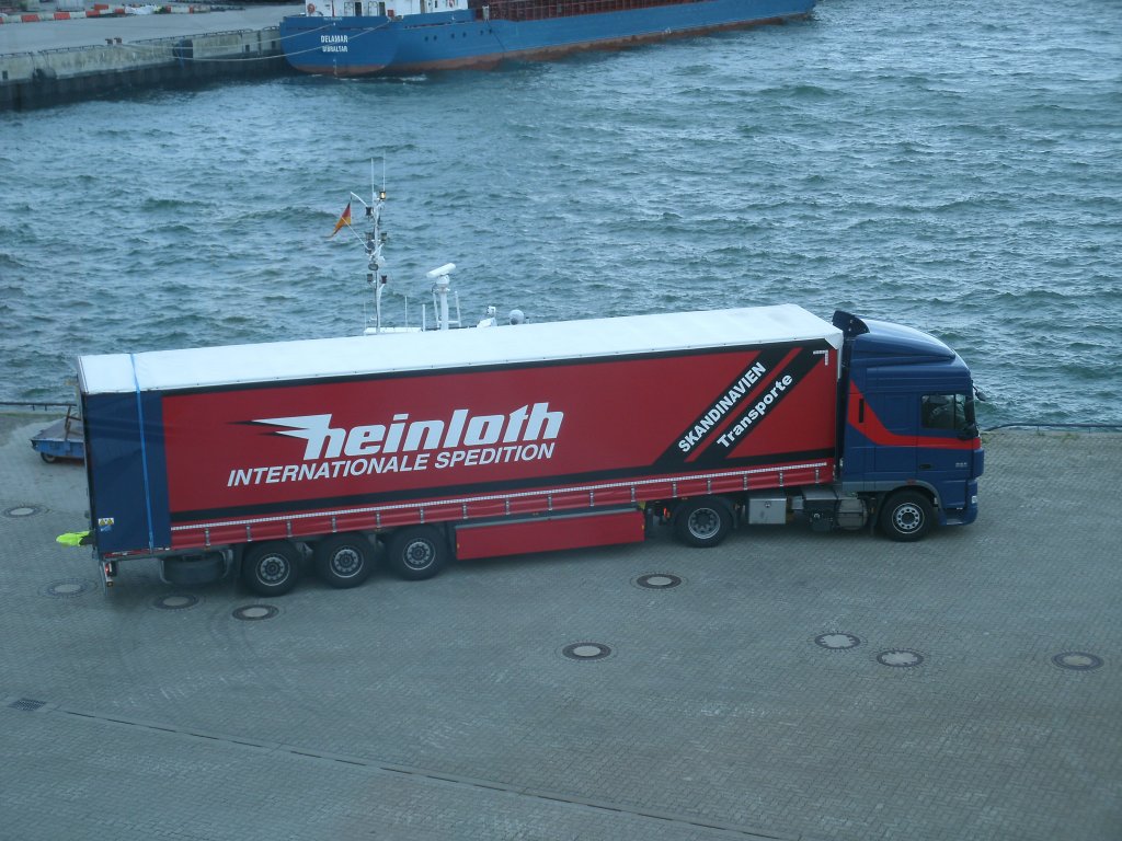 Wie ein Modell fuhr dieser DAF Sattelzug,am 12.September 2011,am Kai entlang zur Fähre in Mukran.Die Aufnahme entstand von der Fussgängerbrücke durch die Fensterscheiben.