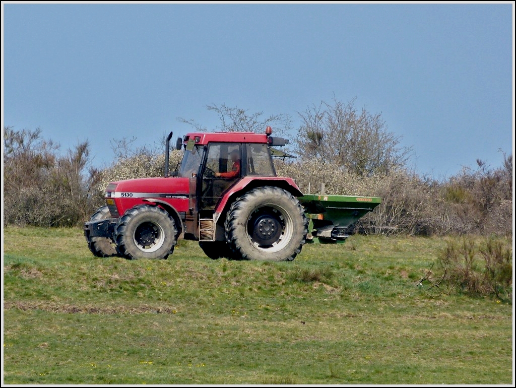 Case 5130 Allrad Traktor mit Düngerstreuer verteilt Volldünger auf sehr unebenem Gelände. 06.04.2012