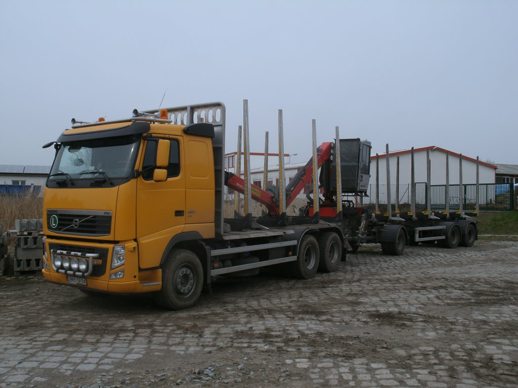 Dieser VOLVO-Hängerzug brachte Holz zur Verladung,am 12.April 2012,zum Bahnhof in Bergen/Rügen.