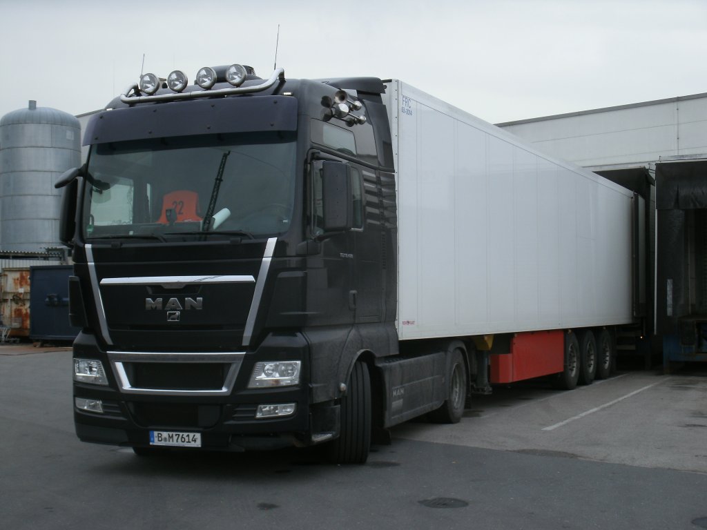 Noch am Spätennachmittag,vom 13.April 2012,wurde dieser Berliner MAN-Sattelzug an einem Supermarkt in Bergen/Rügen entladen.