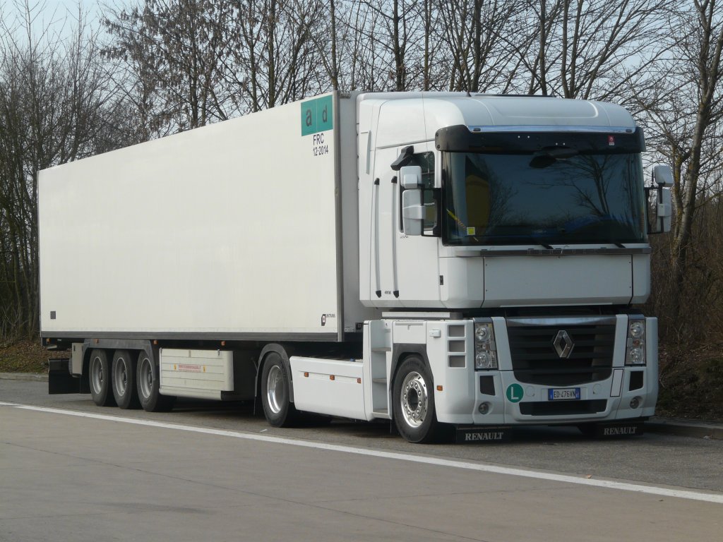 Renault Magnum 480 mit Kühlauflieger aus Italien auf dem Rasthof Ellwanger Berge an der A7, 18.03.2012