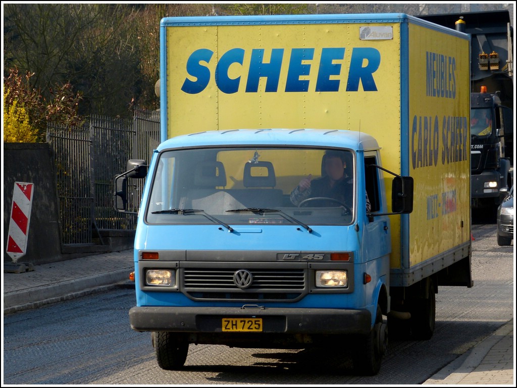 VW LT45 mit Kastenaufbau eines Möbelgeschäftes aus Wiltz aufgenommen am 13.04.2012.