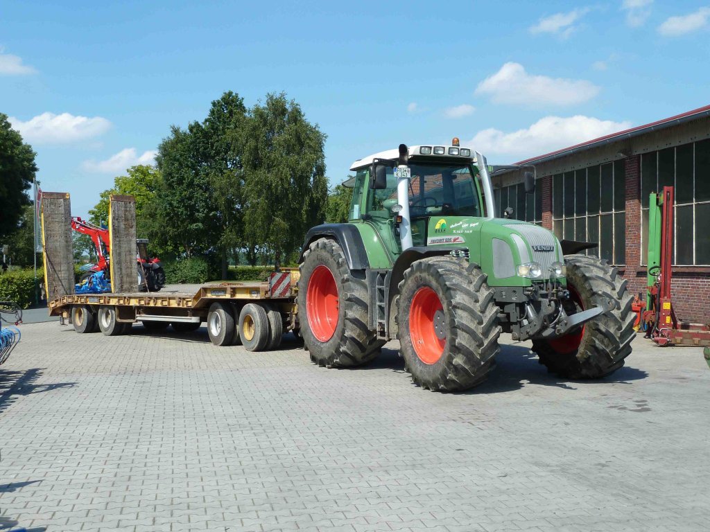 Fendt 411 unterwegs zu seinem künftigen Arbeitsplatz, stehend auf einen Transporter der Spedition Ziegler, August 2012