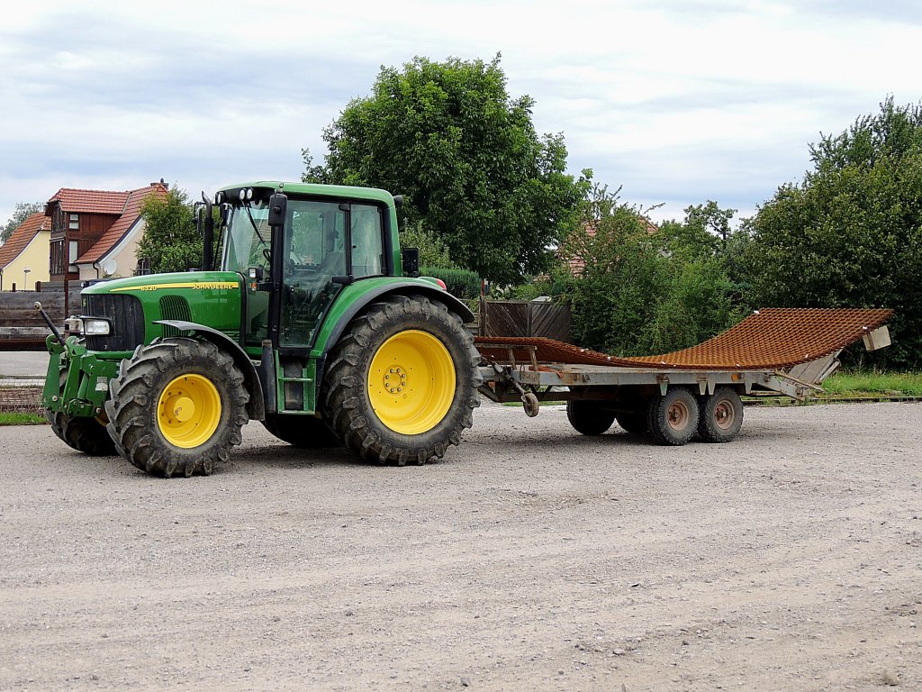 JD-6320 hat am mitgeführten Hänger eine Ladung Stahlbetonmatten;120808