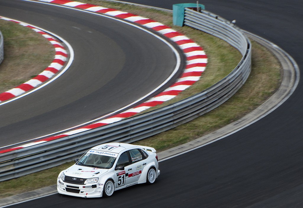 Lada Granta, Team Demfi. Demfi (Hauptsponsor des Rennwagens) ist eine russische Fahrwerk-produzer Firma.