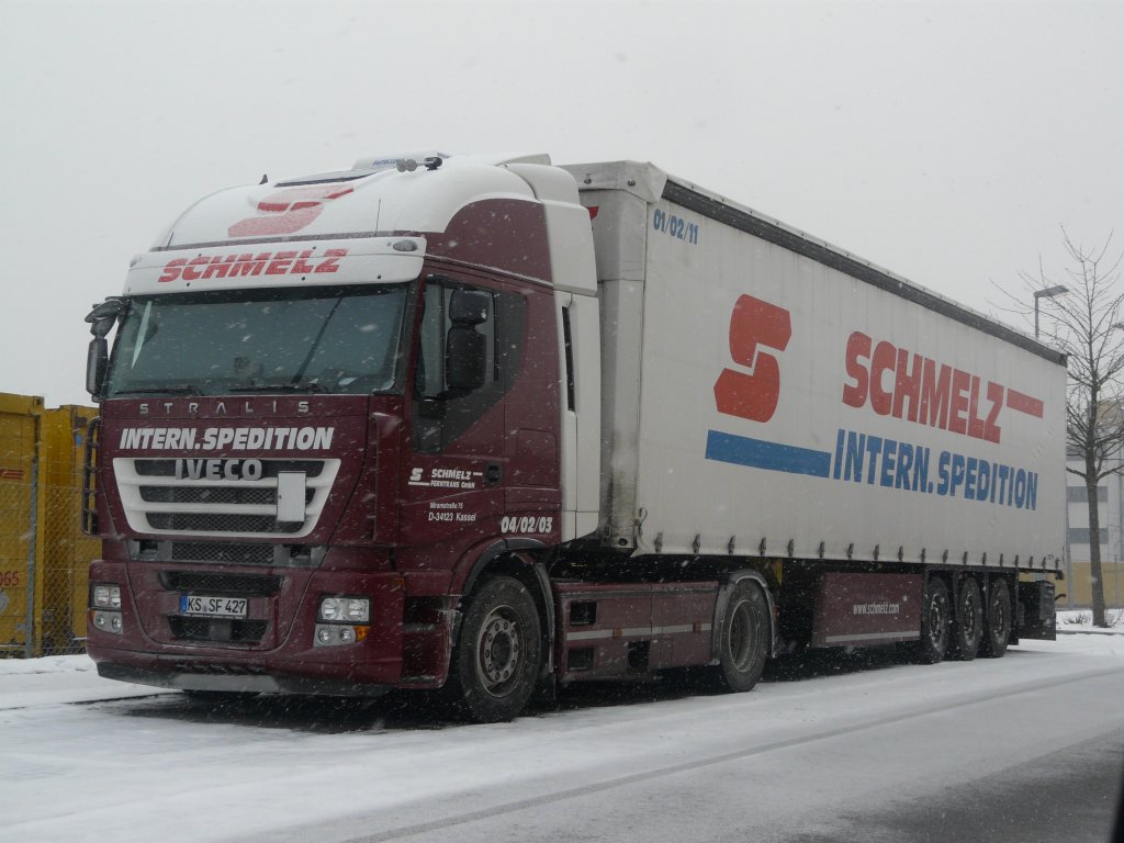 Iveco Stralis der Spedition Schmelz bei starkem Schneefall, abgestellt in einem Industriegebiet in Nürnberg, 09.02.2012