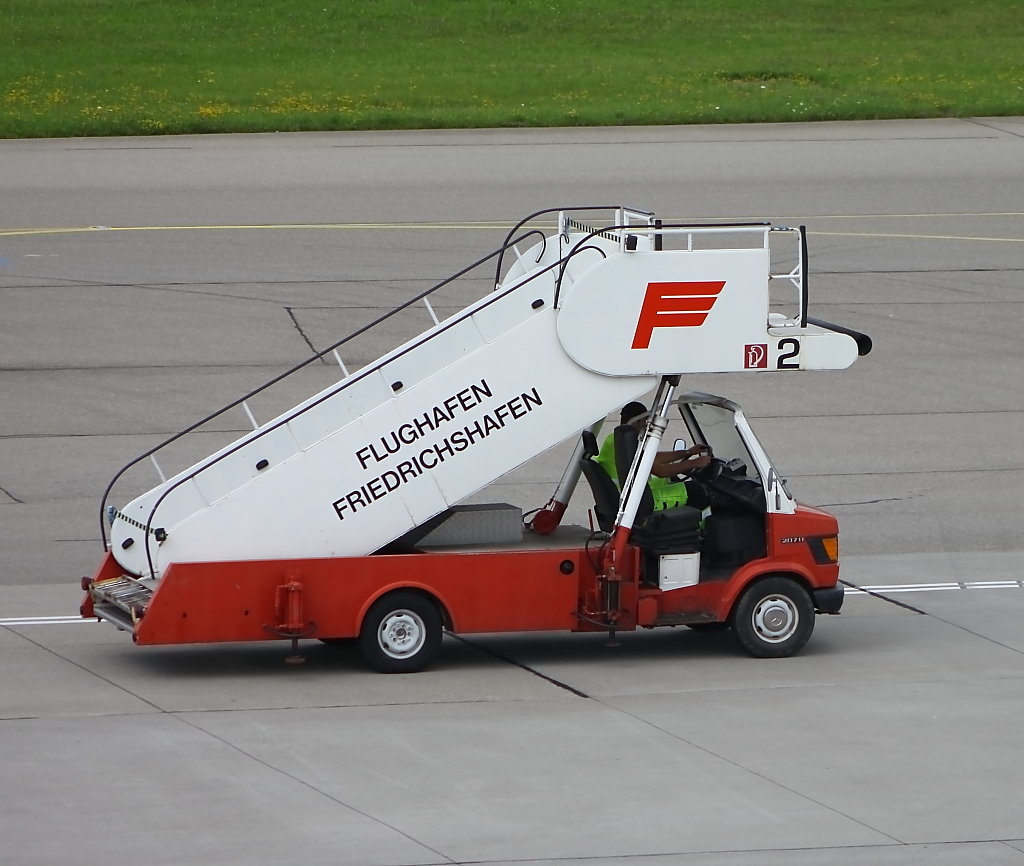 Fahrgasttreppen am Flughafen Friedrichshafen, nach einem Einsatz an einer Boeing 737 der Lufthansa fuhr das Fahrzeug zurück zum Abstellplatz ... Aufgenommen am 11.07.2012