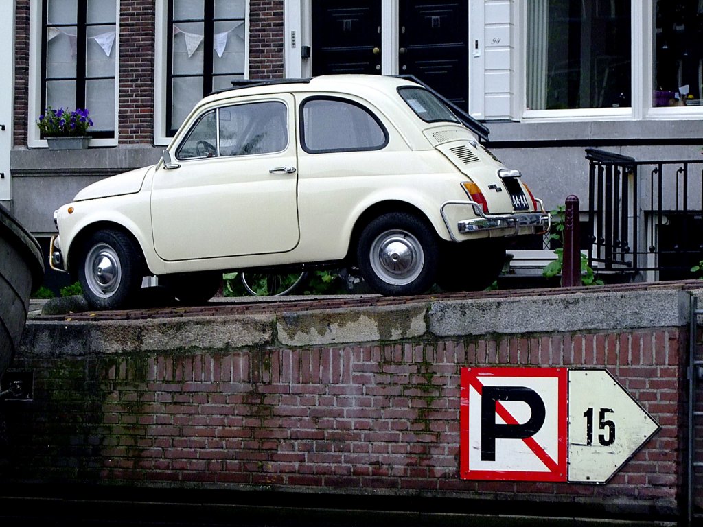 FIAT500 in einer Parklücke entlang einer Gracht in Amsterdam; 110904