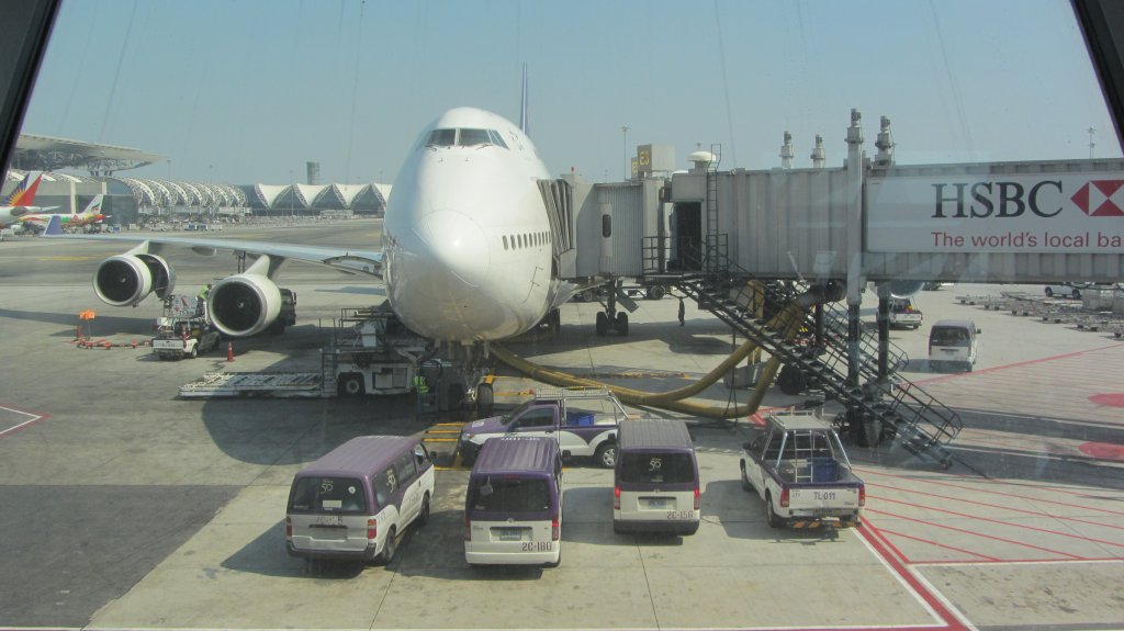Ein Bus auf dem Weg zu einem Flugzeug um die Passagiere zum Terminal zu bringen, aufgenommen am Bodensee Airport in Friedrichshafen, Aufnahmedatum: 11.07.2012