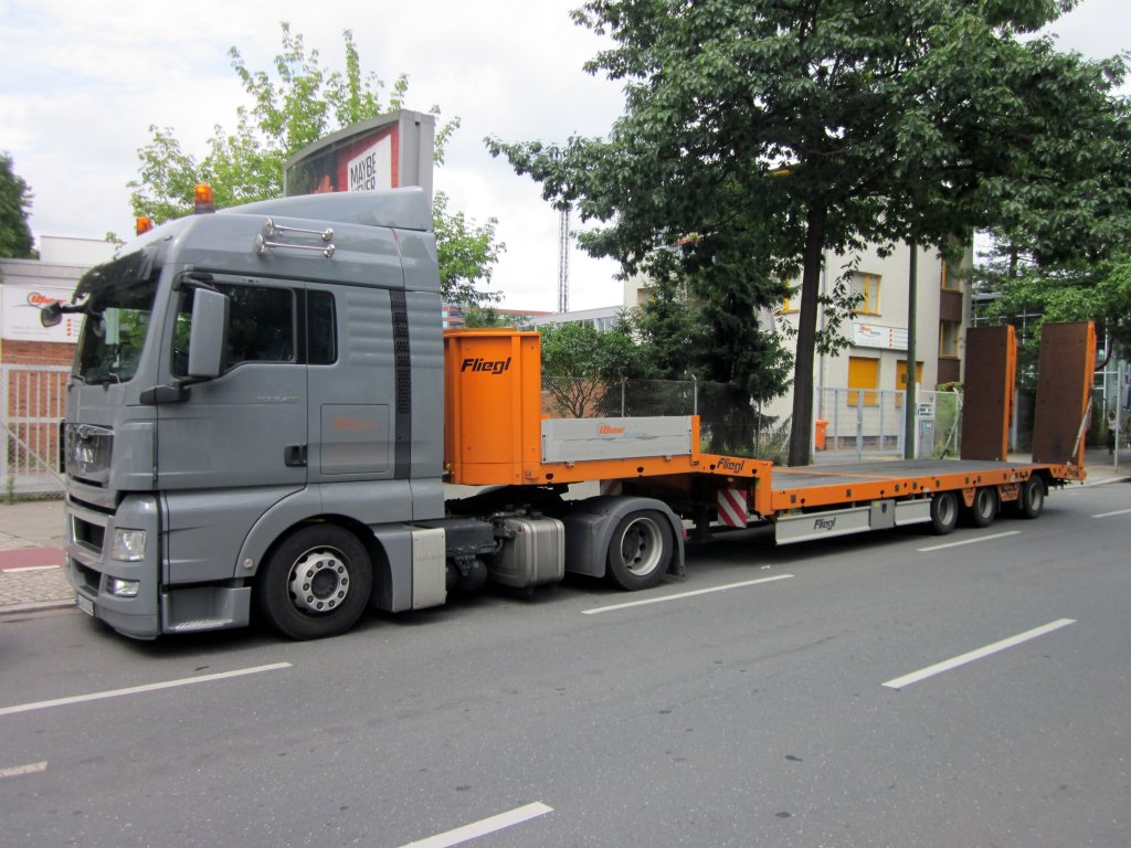 MAN TGX 18.400 Lowliner mit Fliegl-Satteltieflader am 07.07.2012 abgestellt in Berlin.
