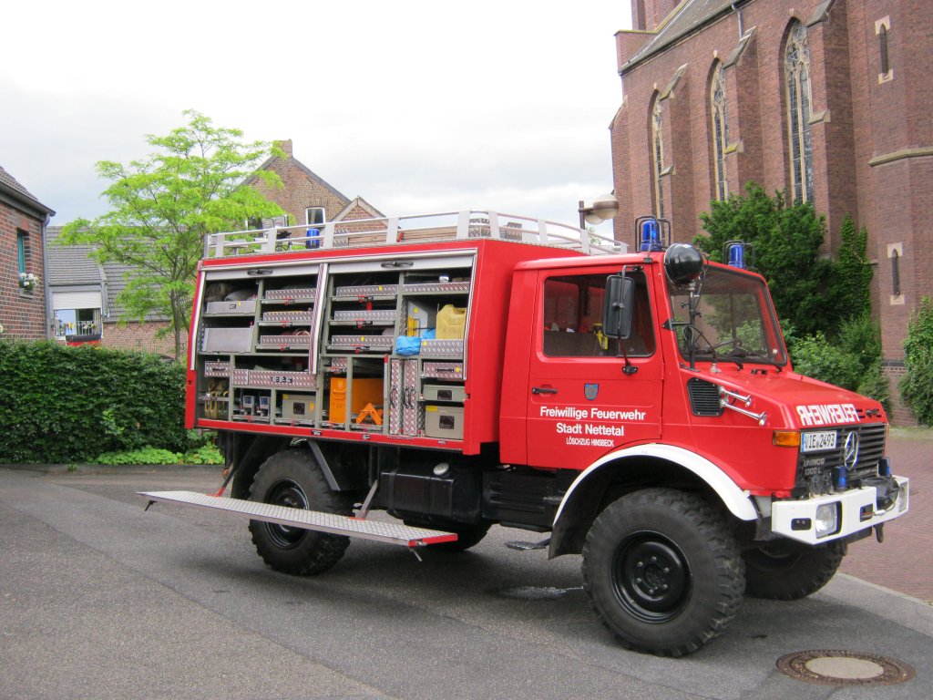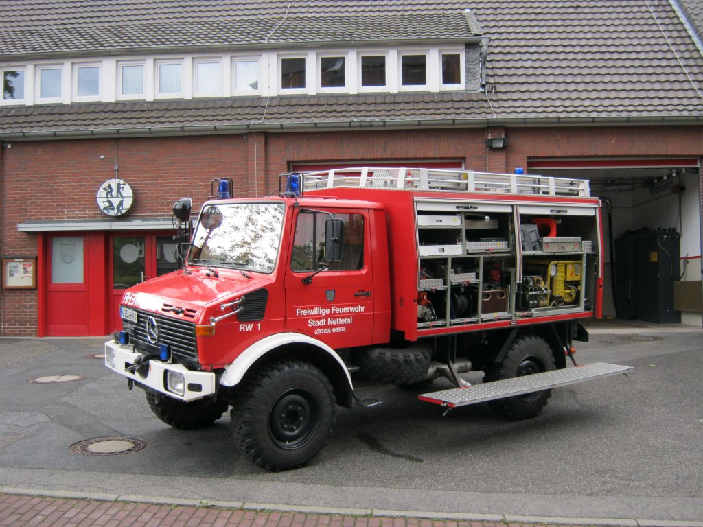 Rüstwagen RW 1 der Freiwilligen Feuerwehr Nettetal, Löschzug Hinsbeck. Bei diesem RW 1 handelt es sich um ein ehemaliges Fahrzeug des Katastrophenschutzes. Technische Daten: Fahrgestell: Mercedes-Benz Unimog U 1300 L Der RW-1 ist bei einem Foto Termin am 11.6 12 am Gerätehaus Hinsbeck in Nettetal aufgenommen worden