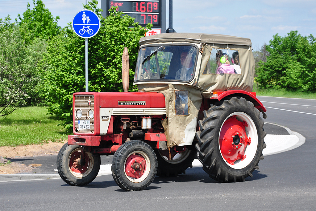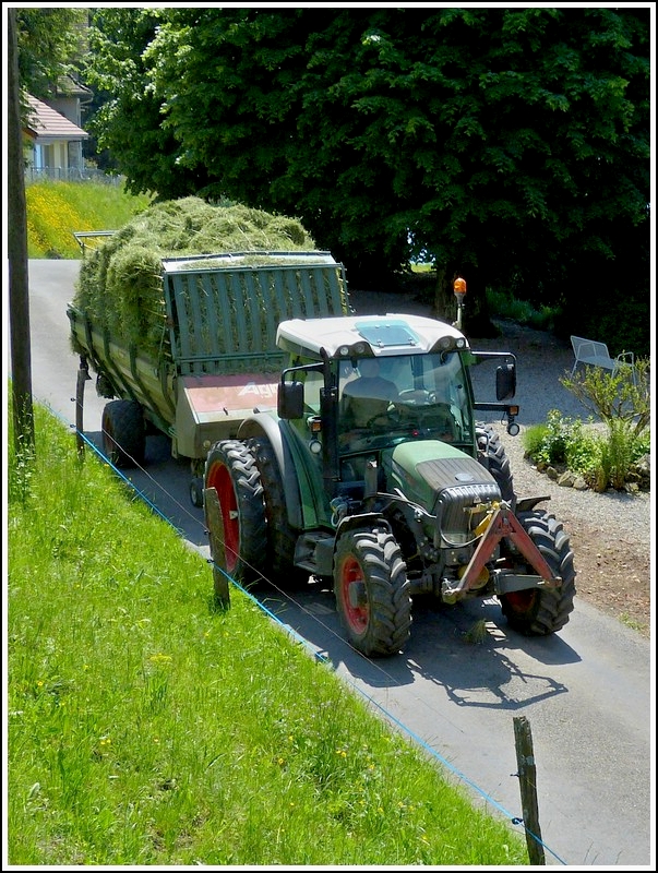 FENDT 310 VARIO TMS zieht einen Rundsiloballen beladenen Hänger auf´s Rieder Messegelände; 120430