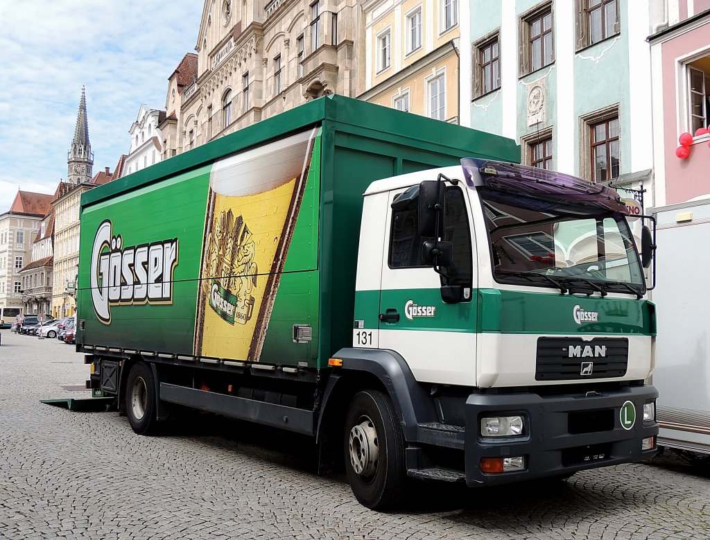 MAN bei der Zustellung von Gösser-Bier am Stadtplatz in Steyr; 120606