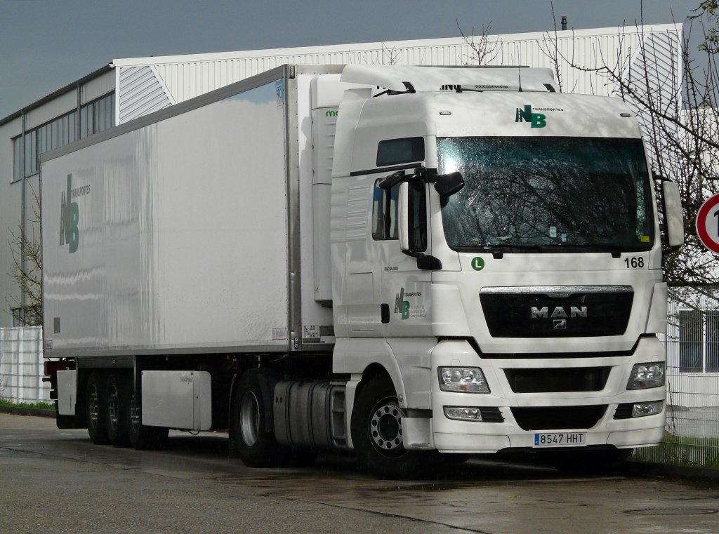 MAN TGX 18.480 mit Kühlauflieger von "NB Transportes" aus Spanien wartet vor einem Darmsortierbetrieb auf Be-/Entladung. Gesehen in Crailsheim am 22.04.2012