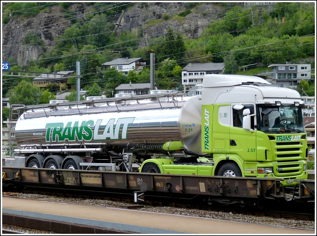 Scania R480 Tanksattelzug auf einem Rolazug in Richtung Italien gesehen in Brig am 22.05.2012.
