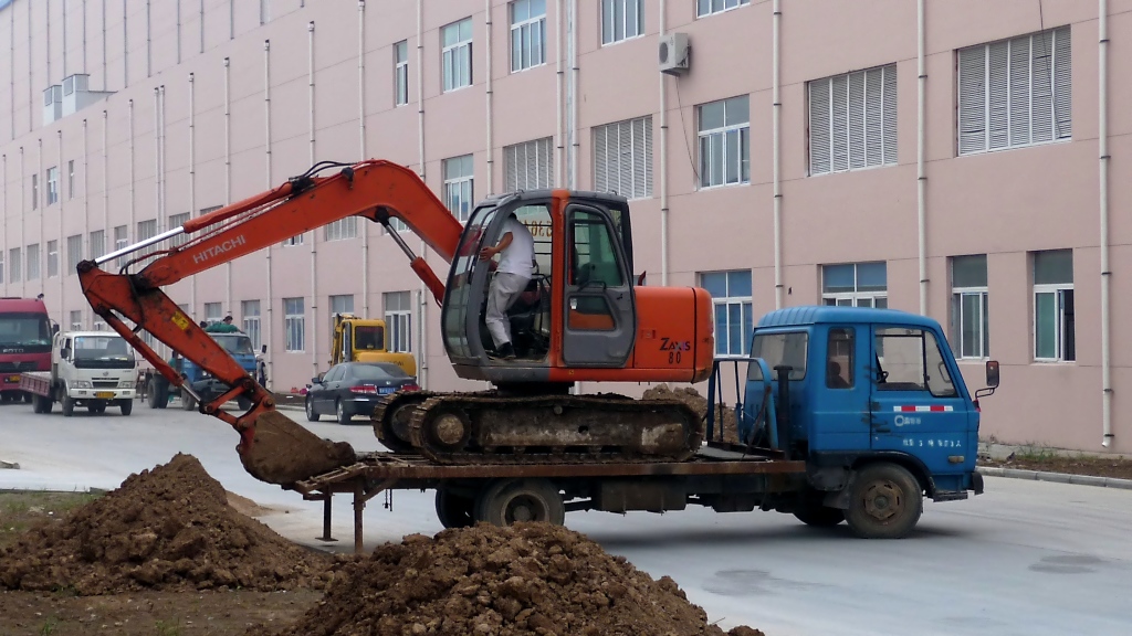 Bagger abladen auf chinesische Art, Teil 1: Mit dem LKW an die Entladestelle heranfahren. (Shouguang, 29.7.11)