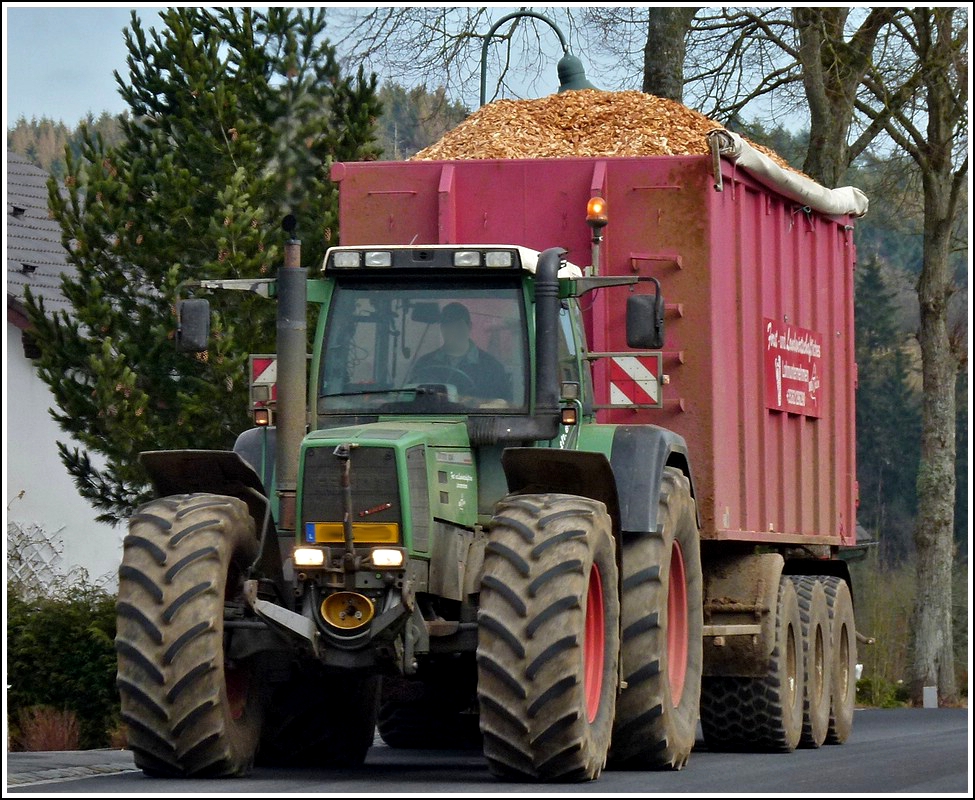 Auch dieser Fendt Traktor war am 01.03.2012 mit einem vollen Kipper mit Holzschnitzel unterwegs.