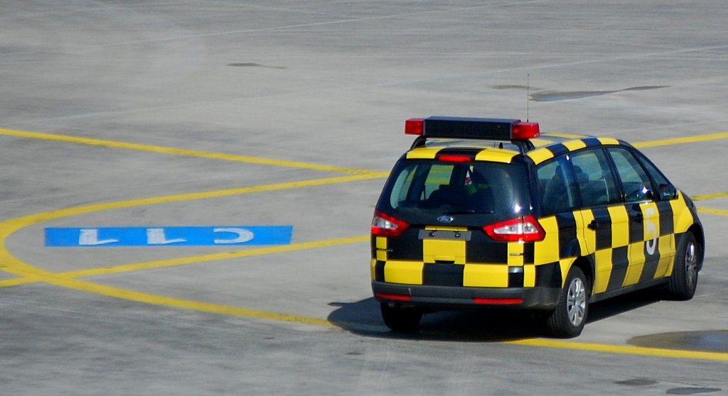 Smart fortwo in der Lackierung eines Vorfeldkontrollfahrzeuges. Hiermit fahren die Bediener der Fluggastbrücken