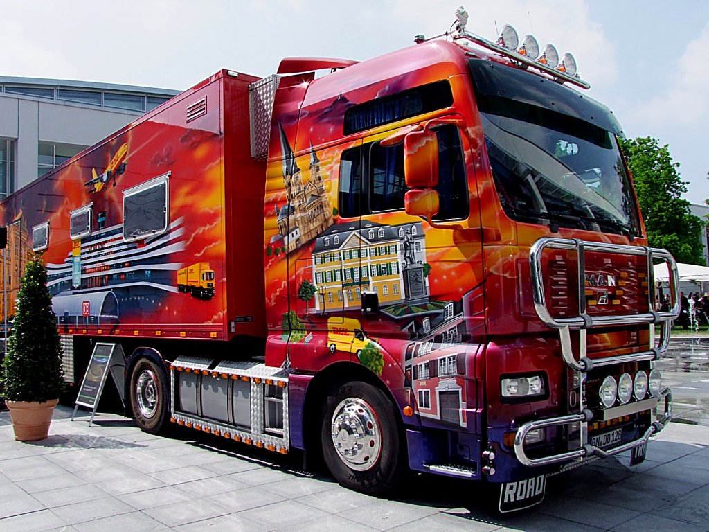 Bunte MAN-Sattelzugmaschine wirbt für DHL, auf der Transport-Logistic 2011 in München; 110513