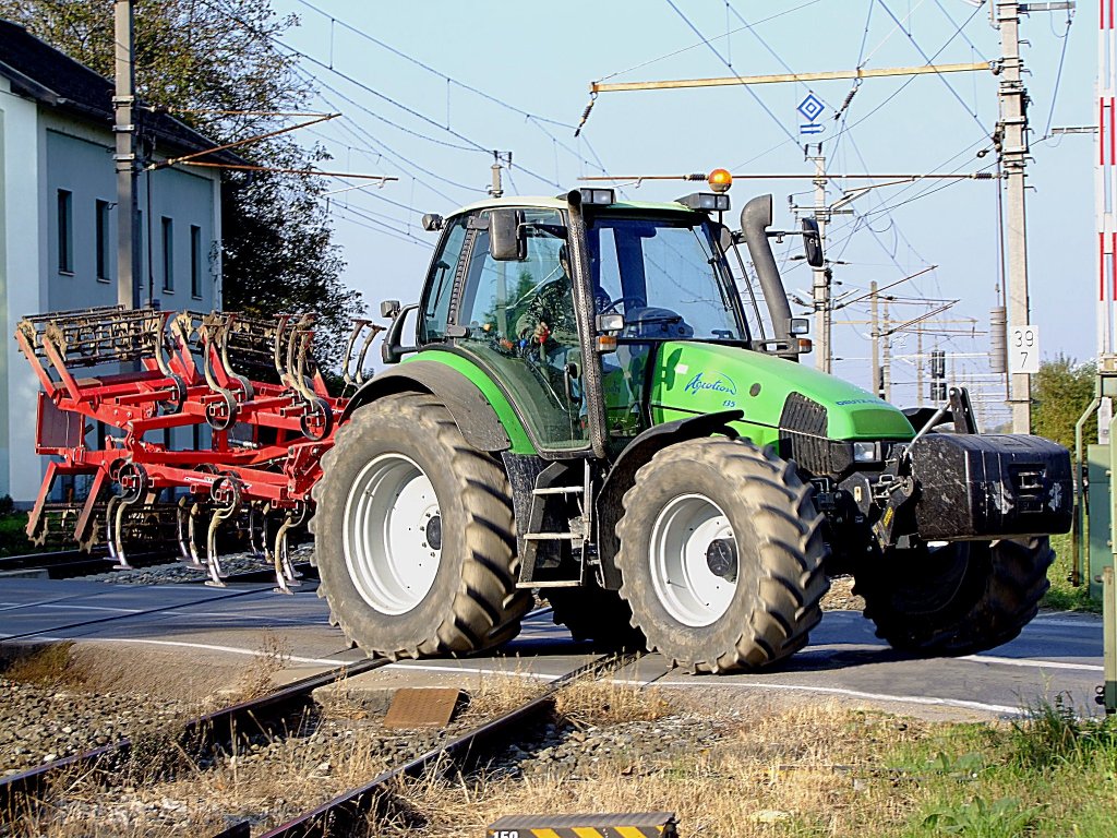 DEUTZ-FAHR Agrotron-135 quert mit schwerem Landwirtschaftlichen Gerät einen Bahnübergang entlang der Ostbahn;111018