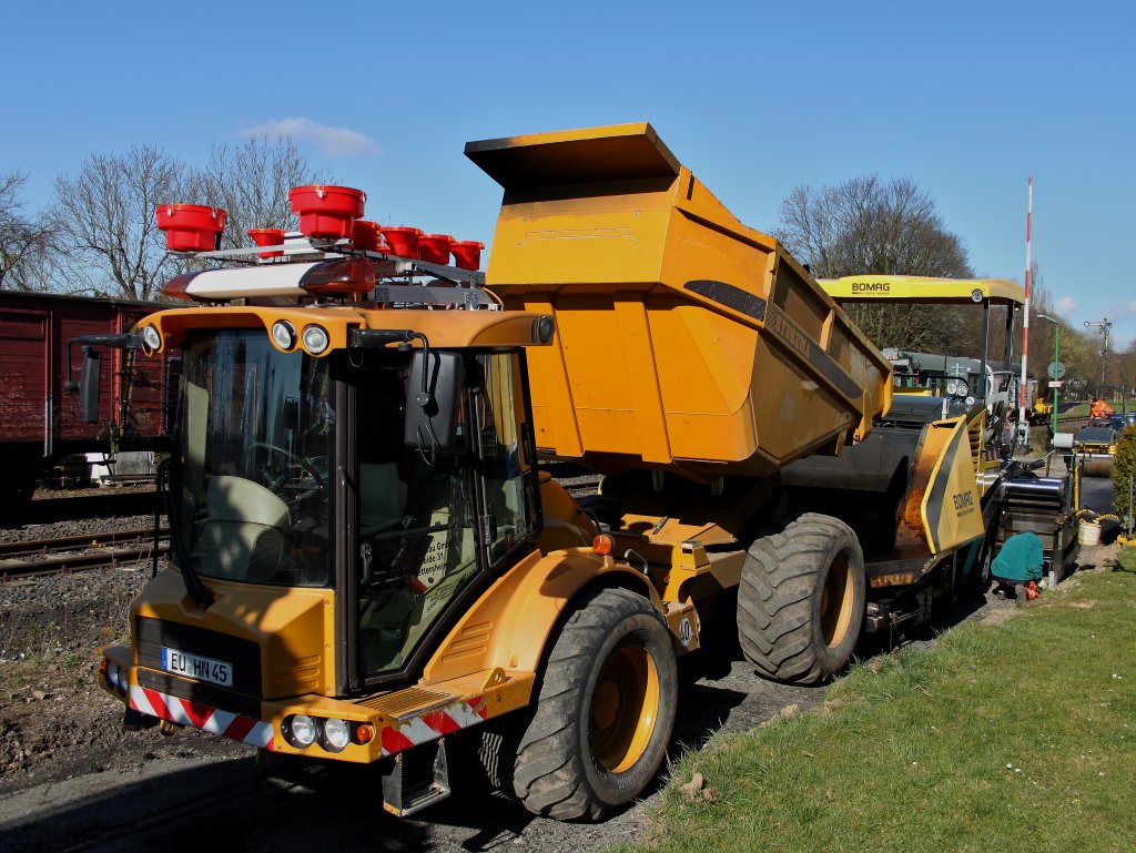 Hydrema Dumper 912D füllt am 19.03.2012 einen Bomag Asphaltfertiger mit neuen Material.