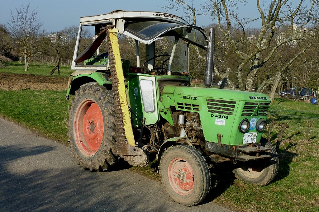 Deutz D4506, mit seitlich angebautem Mähbalken, luftgekühlter 3-Zyl.Diesel, 2826ccm und 40PS, gebaut von 1972-80, März 2012