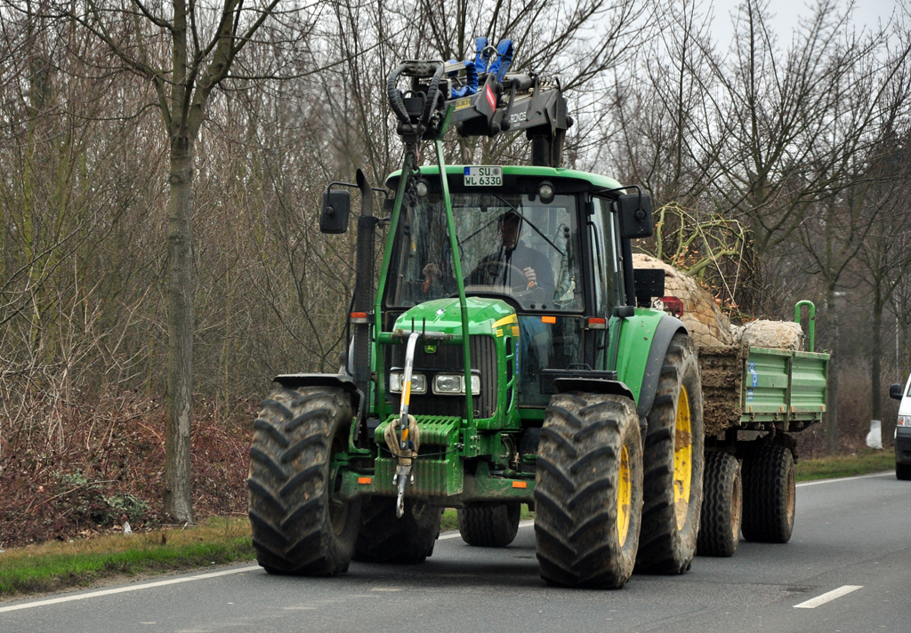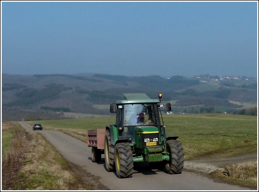 Dieser John Deere Traktor hat keine Mühe seinen leeren Hänger den Berg hinauf zu ziehen. März 2012