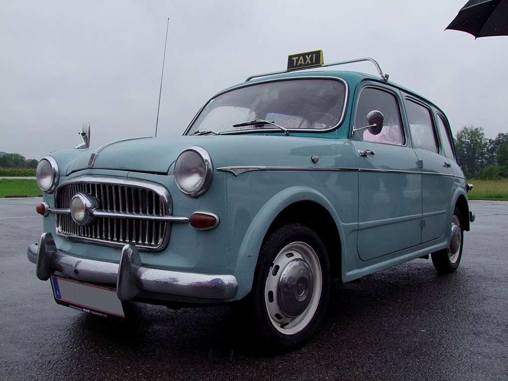 Fiat-1100M Familiare erscheint trotz Regenwetter mit einem alten Taxi-Schild zu einer Oldtimerveranstaltung; 110724