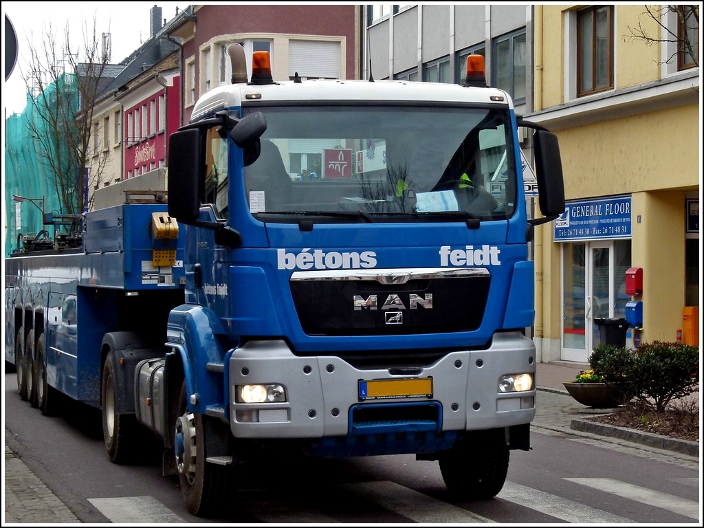 MAN Sattelzug mit vorgegefertigten Betonteilen in seinem Spezialhänger gesehen am 19.03.2012. Mit diesem Gefährt ist es oft nicht einfach durch die viel befahrenen engen Strassen grösserer Ortschaften zu fahren.