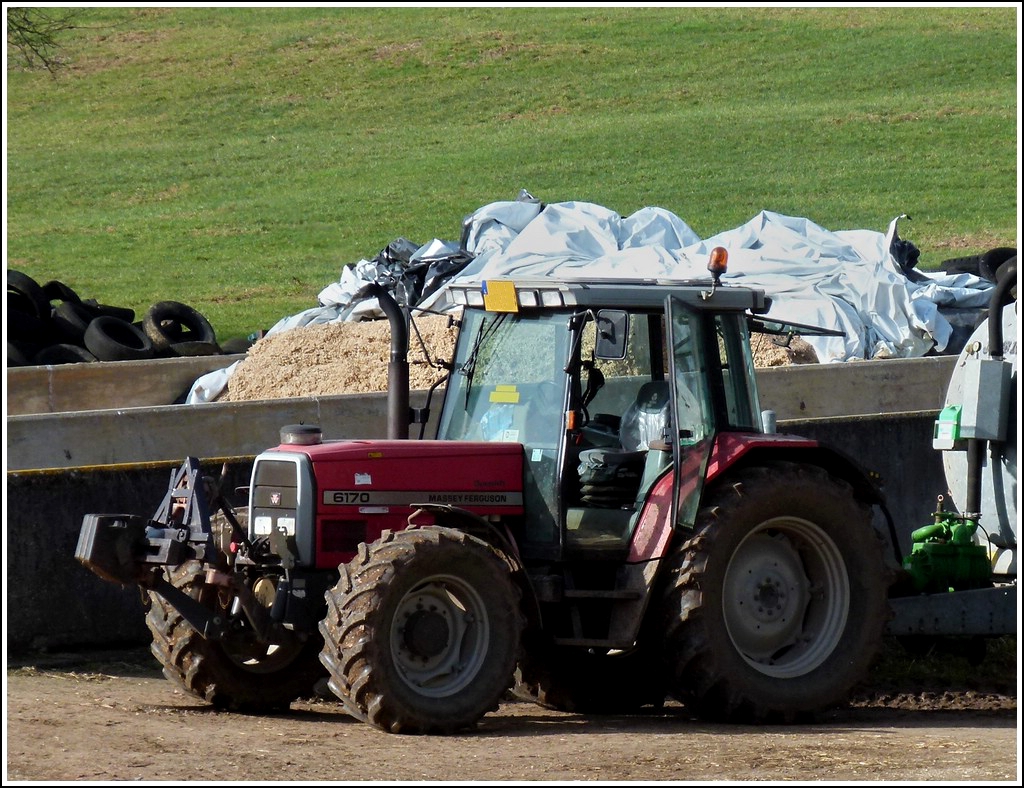 Massey-Ferguson 6170 steht während dem befüllen seines angehängten Güllefasses mit laufendem Motor zum antreiben der Saugpumpe auf einem Hof. 09.03.2012