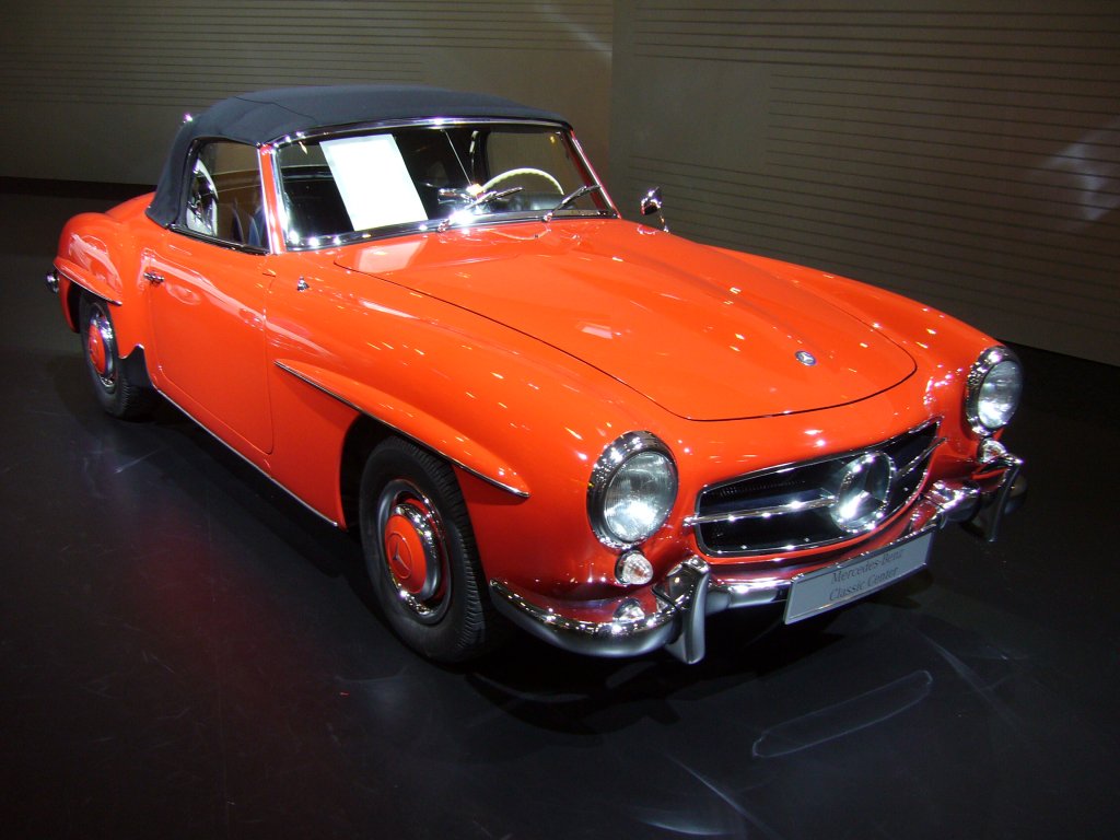 Mercedes Benz 190 SL (W121 B II). 1955 - 1963. Auf Anregung des USA Mercedes Benz Importeurs Maxi Hoffmann wurde der 190 SL auf Basis des Typ 180 entwickelt. Der recht rauh laufende 4-Zylinderreihenmotor leistet 105 PS aus 1.897 cm³. Ein solch zweisitziger Roadster war ab DM 16.500,00 zu haben. Ein zusätzliches Hardtop-Coupedach stand mit DM 1.150,00 in der Aufpreisliste. Techno Classica am 25.03.2012.