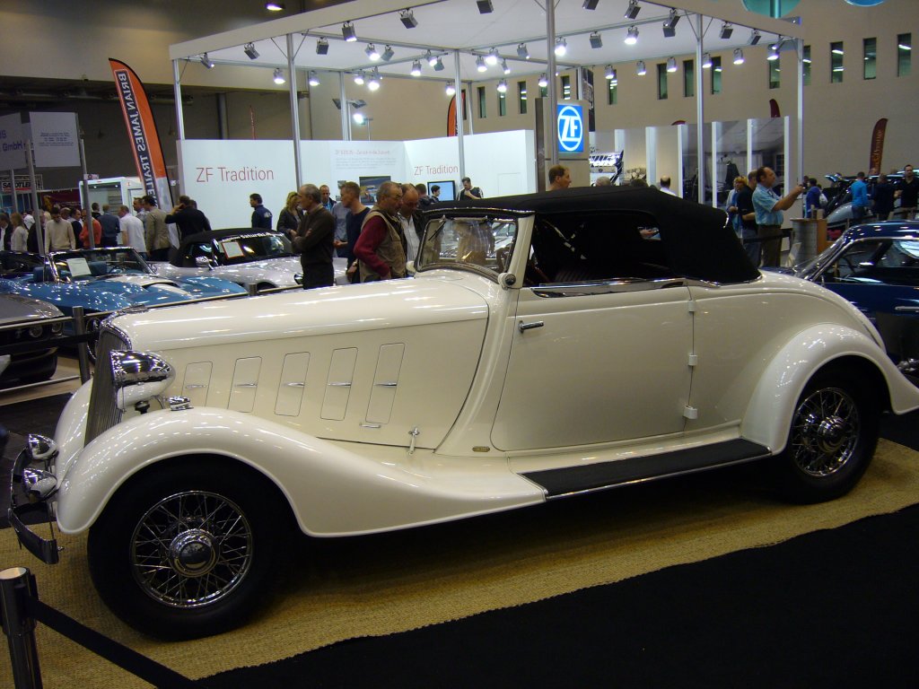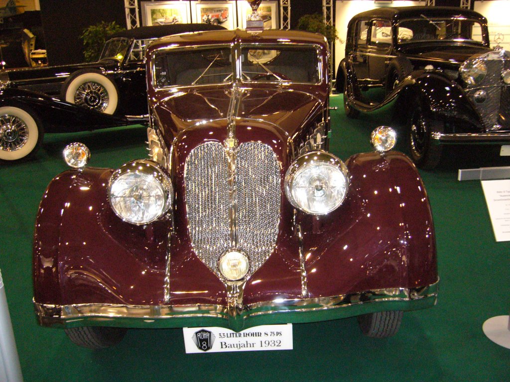 Röhr 8 Typ F mit einer Stromlinienkarosserie von Autenrieth. Der Röhr 8 wurde in verschiedenen Serien von 1927 - 1934 produziert. Vom Typ F wurden zwischen 1933 - 1934 nur ca. 250 Fahrzeuge produziert. Der 8-Zylinderreihenmotor mit 3.287 cm³ leistet 75 PS. Die Höchstgeschwindigkeit liegt bei 120 km/h. Techno Classica am 25.03.2012.