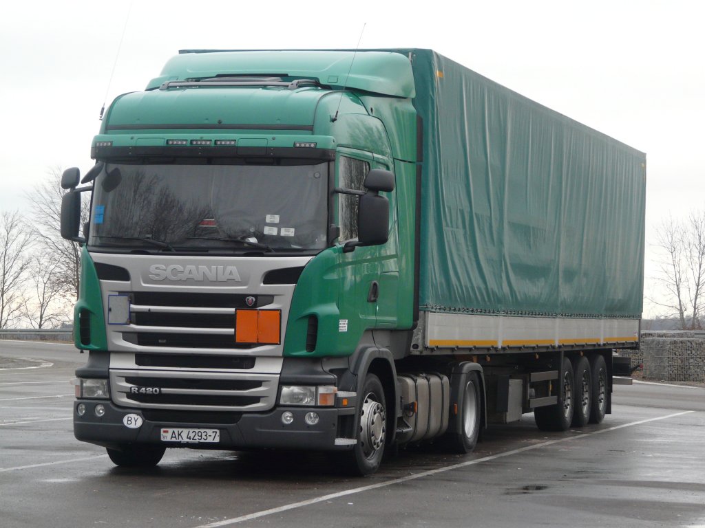 Scania R420 aus Weißrussland auf einem Parkplatz an der A6, 18.02.2012
