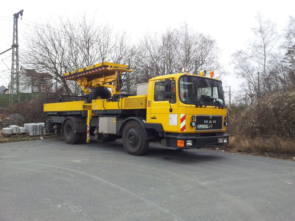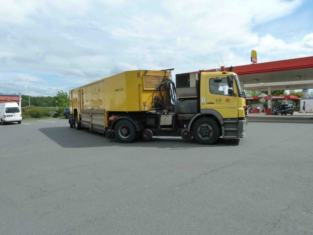 MB 1833 als Spezialfahrzeug für Schienenschleiftechnik rangiert auf dem Autohof Waltershausen, Mai 2012. Nach Aussage des Begleitpersonals gibt es weltweit 2 dieser Fahrzeuge.