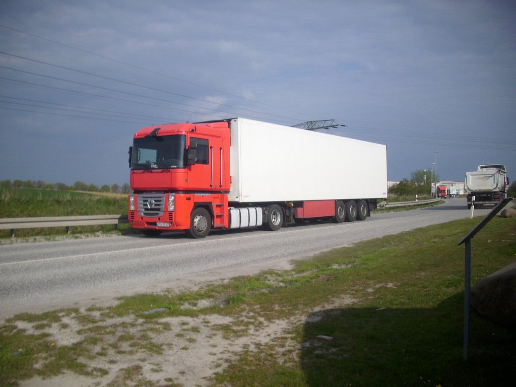 Renault Magnum 480 mit Kühlauflieger von "Andrea Lieb" aus Spanien genießt die ersten Sonnenstrahlen des Ostersonntags auf dem Rasthof Wörnitz, 08.04.2012