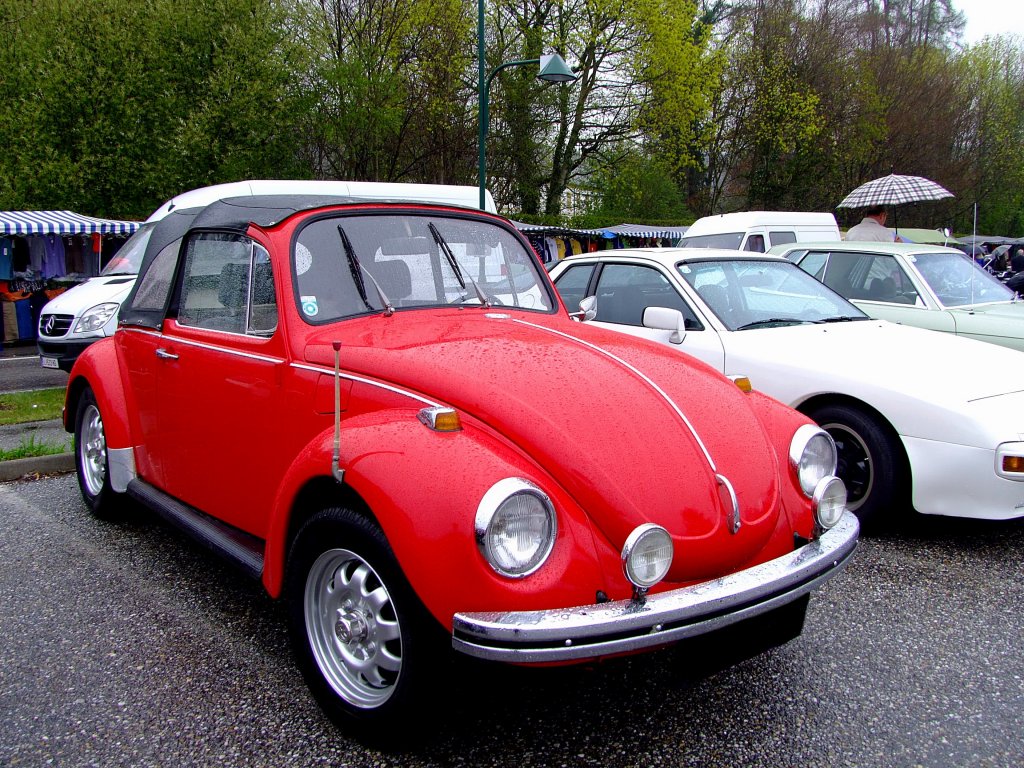 VW Käfer-1302 mit Cabrio-Verdeck nimmt trotz Regenwetter an einer Oldtimerveranstaltung teil; 120415